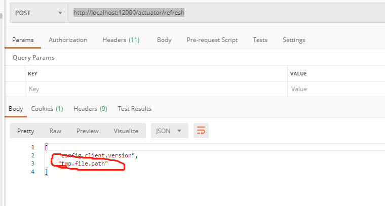 请求 http://localhost:12000/actuator/refresh 进行单机刷新,接口返回发生变动的参数