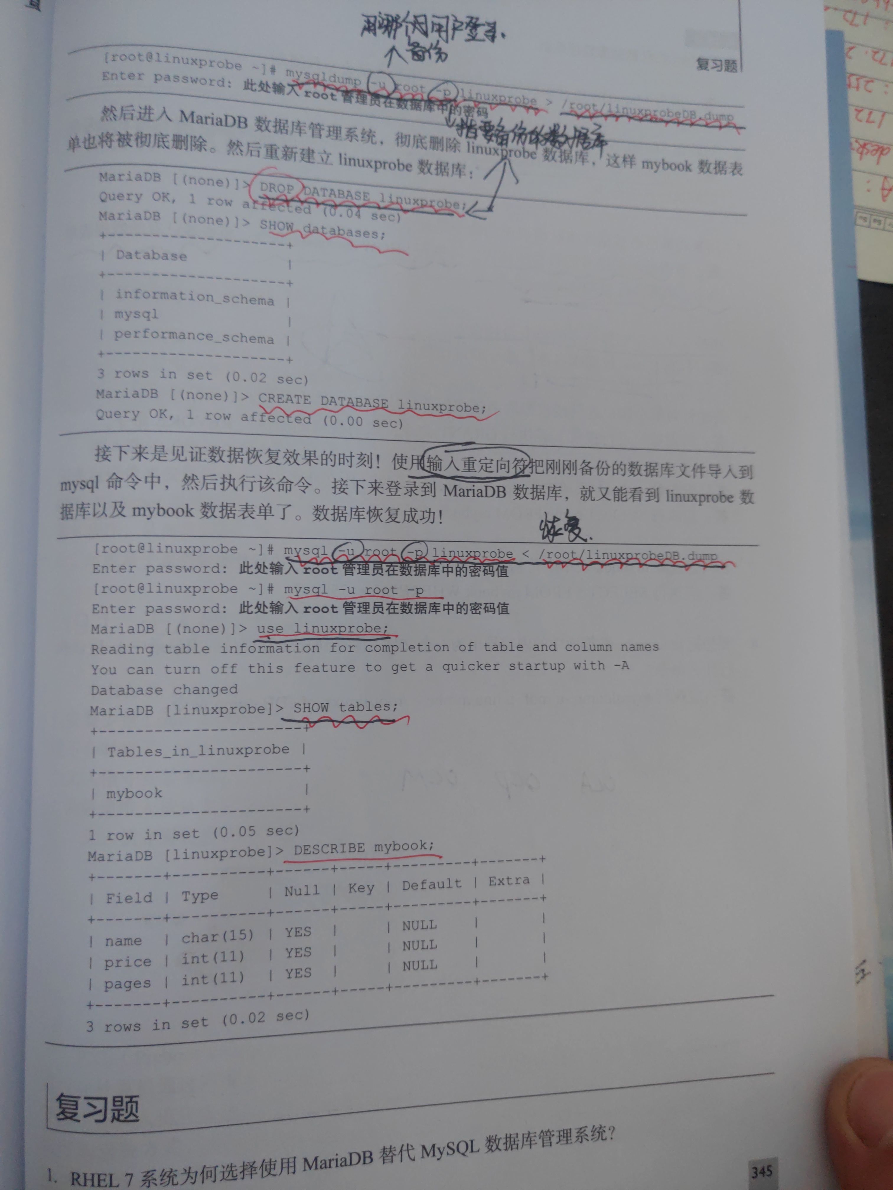 [root@linuxprobe ~]# mysql -u root -p linuxprobe < /root/linuxprobeDB.dump #创建数据库,不过内容是空的,使用该命令进行数据库内容的恢复