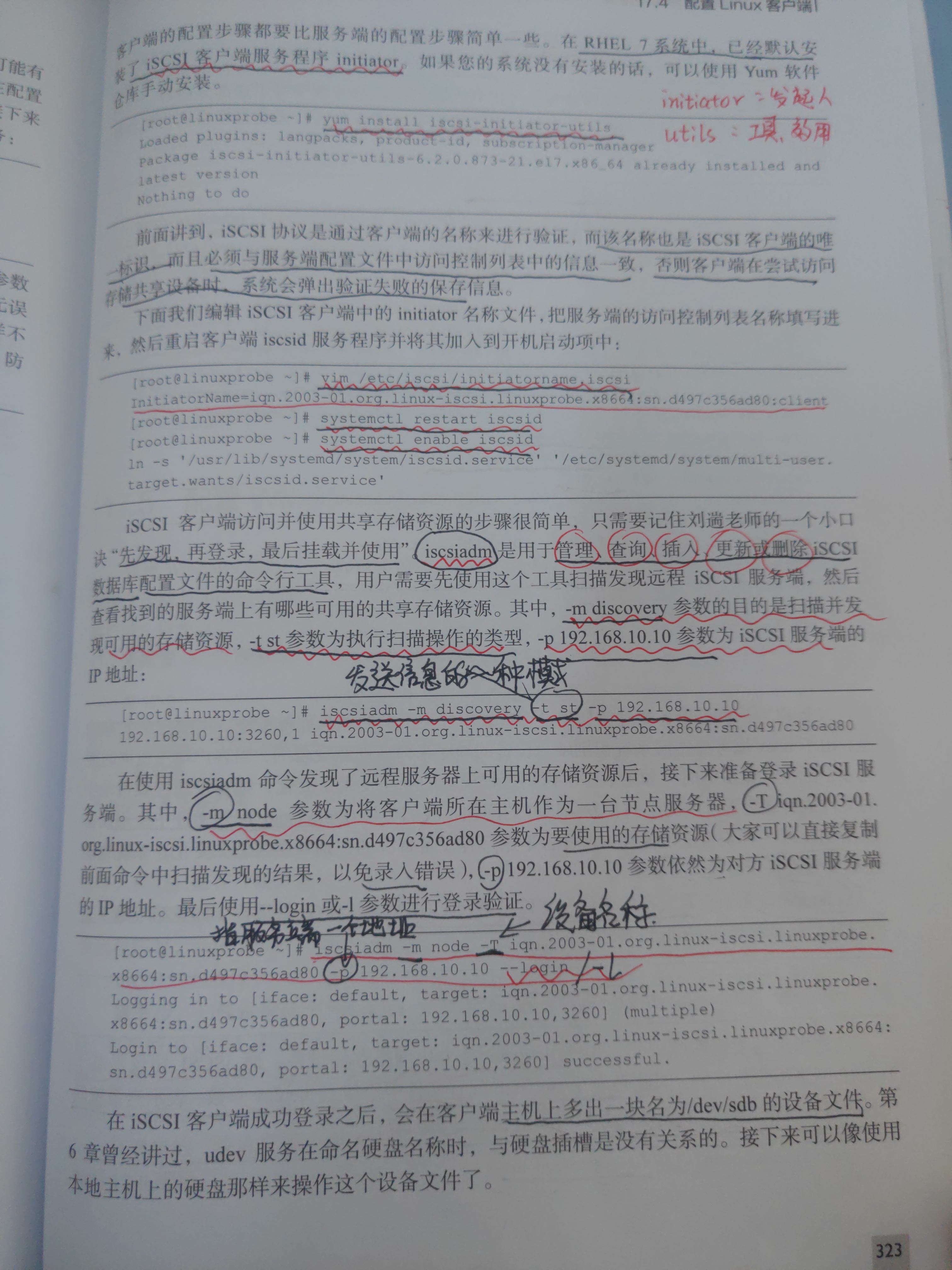 [root@linuxprobe ~]# iscsiadm -m discovery -t st -p 192.168.10.10 #扫描并发现可用的存储资源,-t st 参数为执行扫描操作的类型,-p 192.168.10.10 参数为iSCSI服务端的IP地址