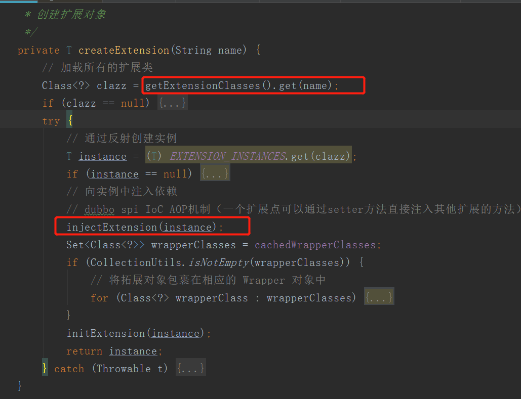 Dubbo IOC 是通过 setter 方法注入依赖。Dubbo 首先会通过反射获取到实例的所有方法,然后再遍历方法列表,检测方法名是否具有 setter 方法特征。若有,则通过 ObjectFactory 获取依赖对象,最后通过反射调用 setter 方法将依赖设置到目标对象中.方法:injectExtension