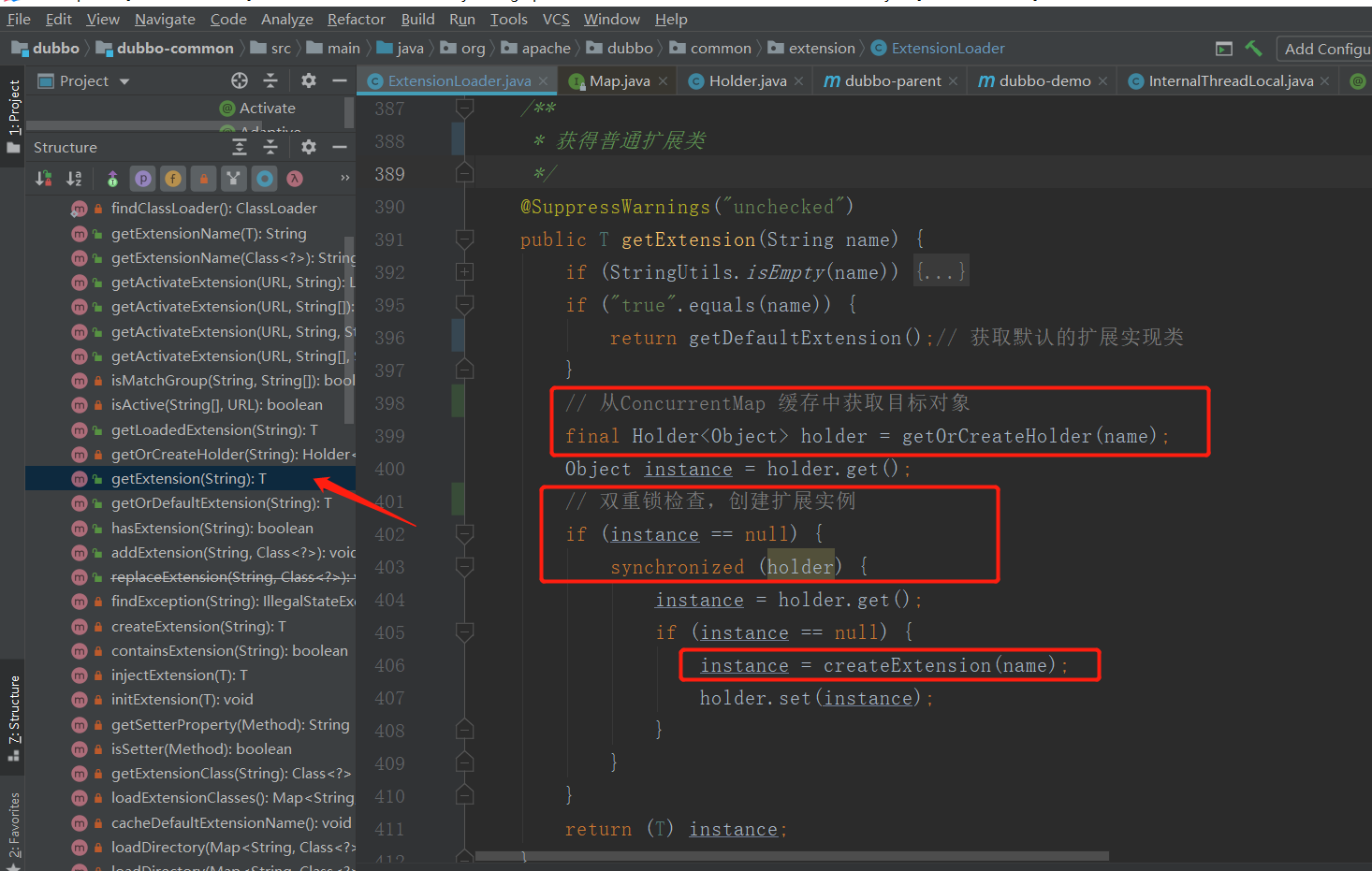 Dubbo 扩展核心类在 dubbo-common模块下,ExtensionLoader,主要方法:getExtension(获得普通扩展类)、getActivateExtension(获得自动激活扩展类)、getAdaptiveExtension(获取自适应扩展类)