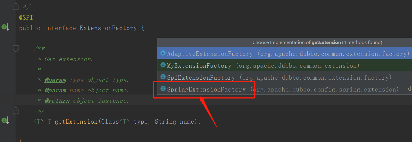 /** * ExtensionFactory */ @SPI public interface ExtensionFactory { /** * Get extension. * * @param type object type. * @param name object name. * @return object instance. */ <T> T getExtension(Class<T> type, String name); }