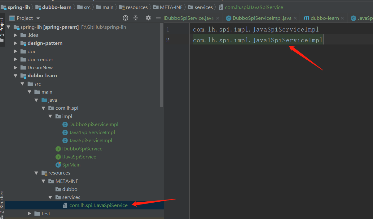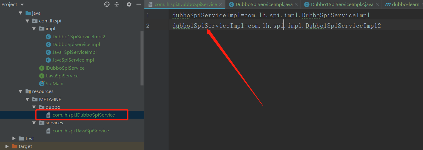 @SPI public interface IDubboSpiService { Object say(); } public class DubboSpiServiceImpl implements IDubboSpiService { @Override public Object say() { System.out.println("dubbo spi impl "); return this.getClass().getCanonicalName(); } } @Test public void dubboSpi() throws Exception { ExtensionLoader<IDubboSpiService> extensionLoader = ExtensionLoader.getExtensionLoader(IDubboSpiService.class); IDubboSpiService dubboSpiServiceImpl = extensionLoader.getExtension("dubboSpiServiceImpl"); System.out.println(dubboSpiServiceImpl.say()); IDubboSpiService iDubboSpiService = extensionLoader.getExtension("dubbo1SpiServiceImpl"); System.out.println(iDubboSpiService.say()); }