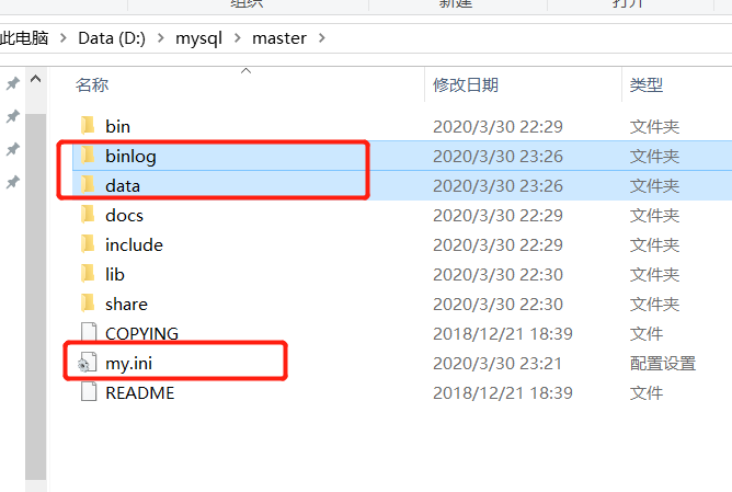 分别新建 data 和 binlog 目录,以及配置文件 my.ini