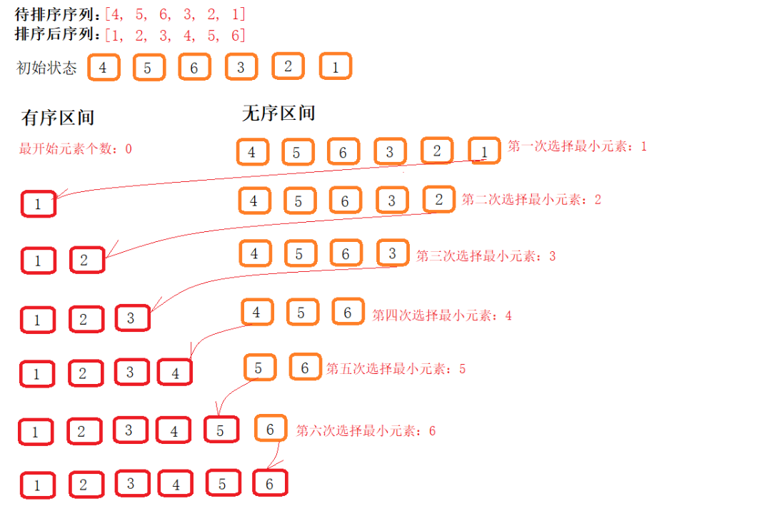 将待排序序列,分成两个区间:有序区间、无序区间。一开始假定有序区间元素个数:0,无序区间元素个数:n。循环遍历无序区间,每一次从无序区间中,选择最小的一个元素,插入到有序区间的末尾。
