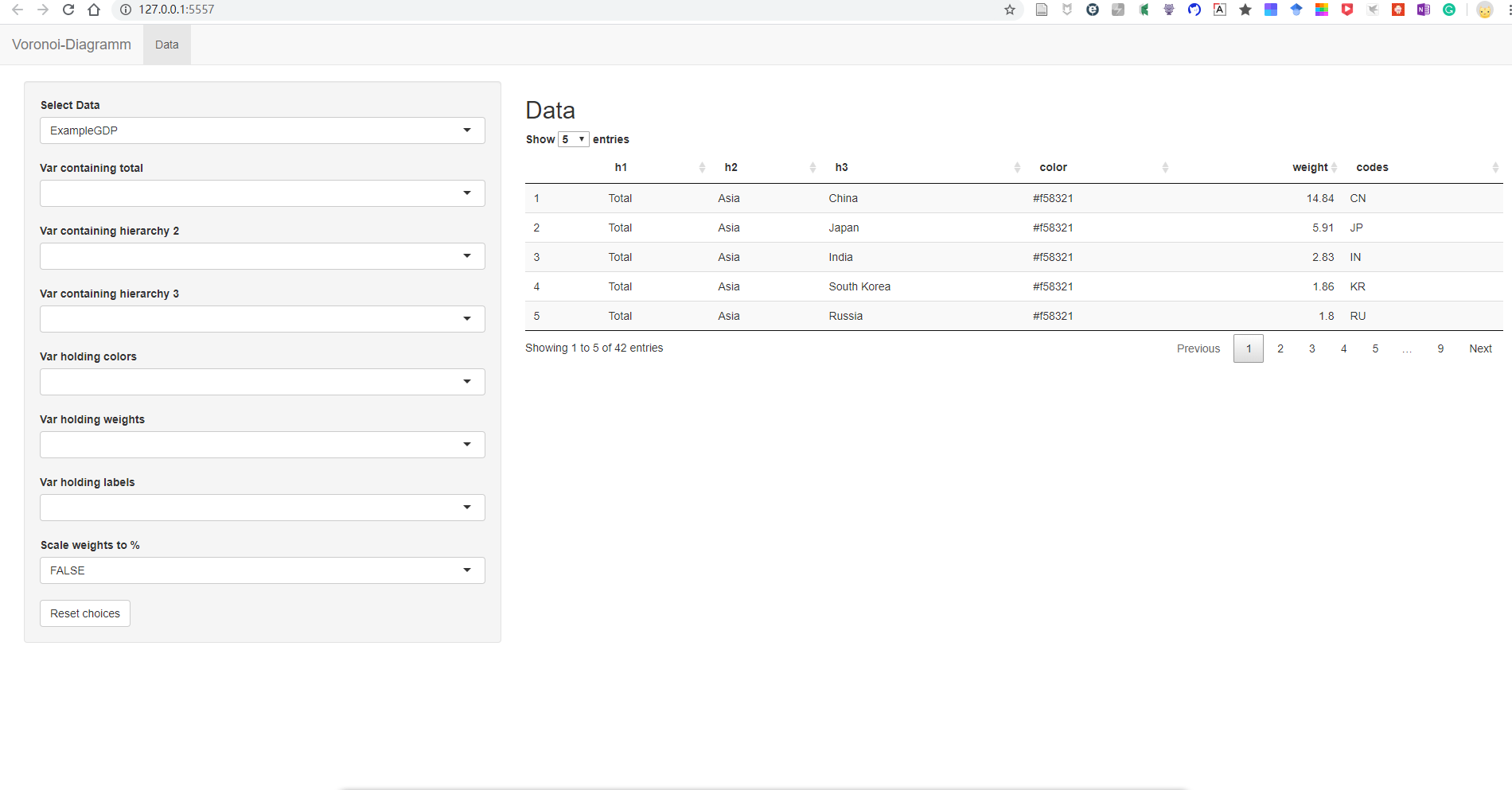第一个函数是将数据框转换作为Voronoitreemap的输入,第二个函数是将输入函数输出为json文件,也就是d3库可以读取与可视化的数据。第三个函数是创建html的widget。第四个函数就是创建一个shiny app。这个包对输入的数据框有具体的要求,必须是特定格式的数据框(也就是与ExampleGDP的数据组织必须完全一样)。满足以下要求: