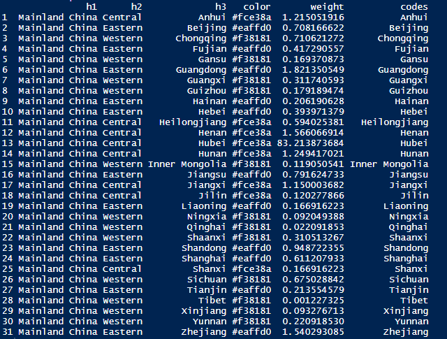 我们以中国大陆区域的疫情数据做测试。h1就是China,h2为东中西部省份,h3为大陆地区31个省级行政区,weight为确诊病例数据的全国占比。这里以约翰霍普金斯大学的数据做示例进行处理。