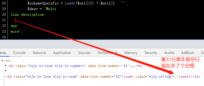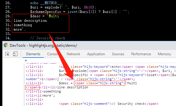 由于我增加的这个标签是在每行的行首,所以它一定是在最左边(自动对齐),且不会破坏前面所讲 <span class="hljs-string"></span> 多行文本标签的闭合。又由于我增加的标签不包含新的文本内容,所以并未改动原代码。