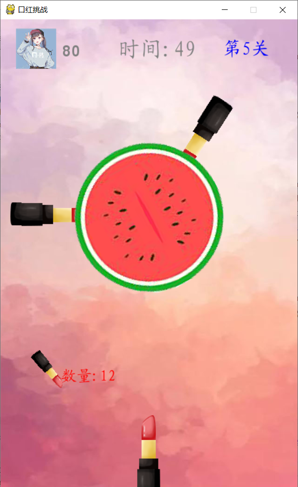 鼠标点击口红命中中间旋转的西瓜,若命中重复位置的口红,则失败,成功即进入下一关