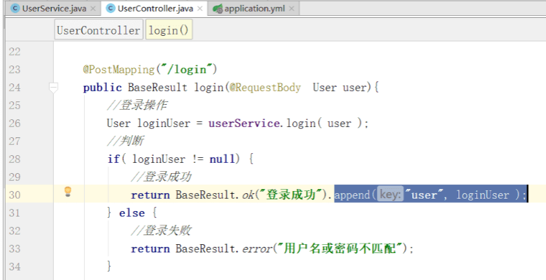 - 步骤一:检查后端,登录成功后,将用户信息返回