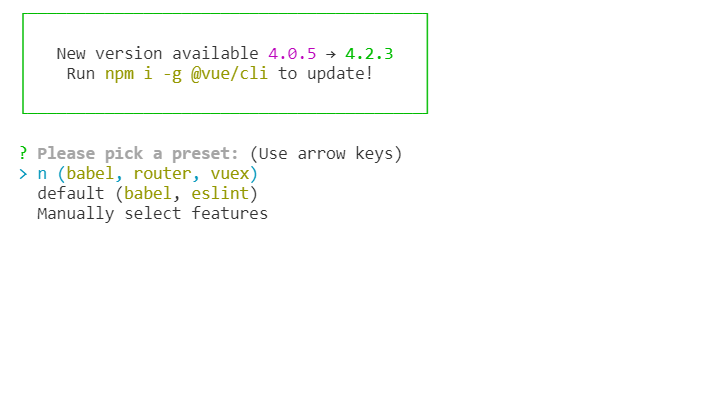 - 步骤一:在使用vue create 创建项目时,需要选择vuex组件(因为个人创建项目时已经保存了模板所以已经不用去勾选了)。