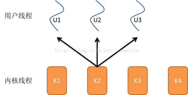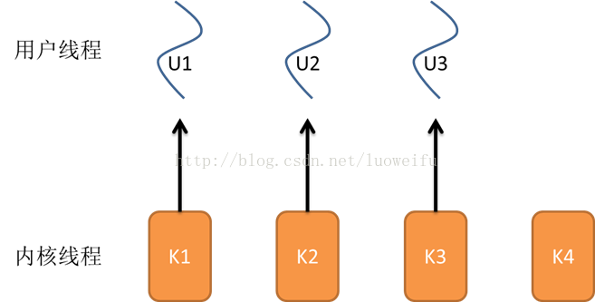 线程又被称为 用户线程(用户态),每一个用户线程都要有一个 内核线程(内核态) 在支持。用户线程 与 内核线程的对应关系有三种模型:一对一模型、多对一模型、多对多模型,在这以4个内核线程、3个用户线程为例对三种模型进行说明: