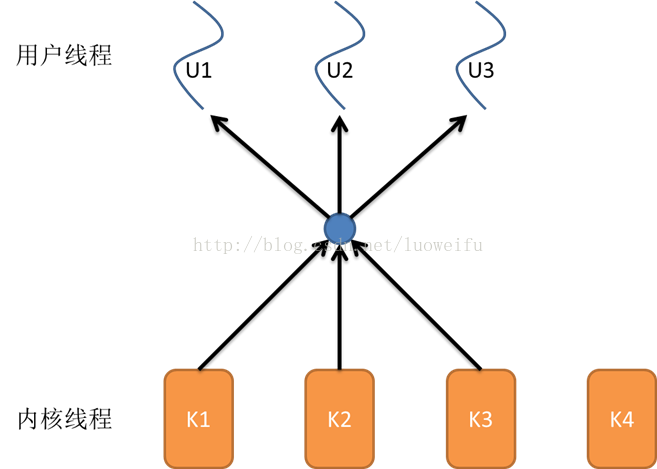 多对一模型将多个用户线程映射到一个内核线程上,线程之间的切换由用户态的代码来进行,因此相对一对一模型,多对一模型的线程切换速度要快许多;此外,多对一模型对用户线程的数量几乎无限制。但多对一模型也有两个缺点:1. 如果其中一个用户线程阻塞,那么其它所有线程都将无法执行,因为此时内核线程也随之阻塞了;2. 在多处理器系统上,处理器数量的增加对多对一模型的线程性能不会有明显的增加,因为所有的用户线程都映射到一个处理器上了。