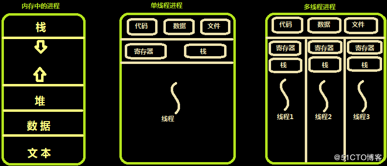 一个标准的线程由线程ID、当前指令指针(PC)、寄存器和堆栈组成。而进程由内存空间(代码、数据、进程空间、打开的文件)和一个或多个线程组成。