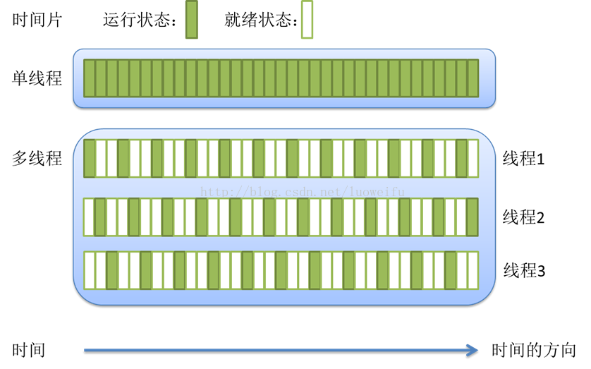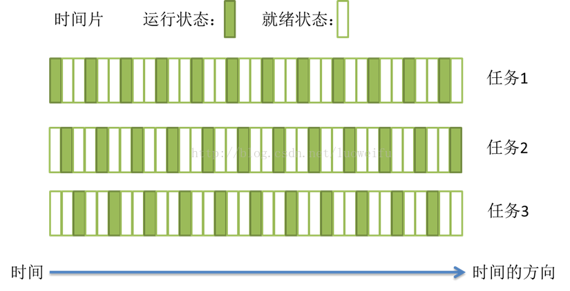 要理解进程和线程,必须要先了解一下操作系统的一些相关概念。大部分操作系统(如Windows、Linux)的任务调度是采用时间片轮转的抢占式调度方式,也就是说一个任务执行一小段时间后强制暂停去执行下一个任务,每个任务轮流执行。任务执行的一小段时间叫做时间片,任务正在执行时的状态叫运行状态,任务执行一段时间后强制暂停去执行下一个任务,被暂停的任务就处于就绪状态等待下一个属于它的时间片的到来。这样每个任务都能得到执行,由于CPU的执行效率非常高,时间片非常短,在各个任务之间快速地切换,给人的感觉就是多个任务在“同时进行”,这也就是我们所说的并发(别觉得并发有多高深,它的实现很复杂,但它的概念很简单,就是一句话:多个任务同时执行)。多任务运行过程的示意图如下:
