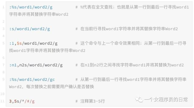 替换的语法如下::{作用范围}s/{目标}/{替换}/{替换标志}