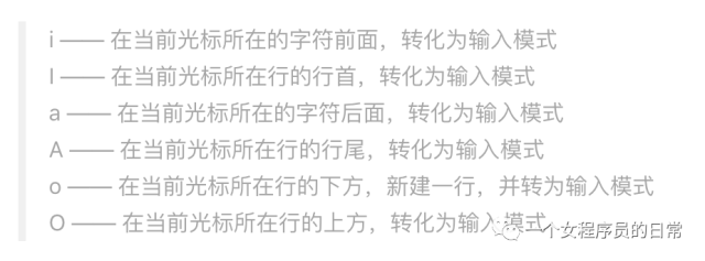 命令模式:用vim打开文件就进入了命令模式;输入模式:在命令模式输入i/I/a/A/o/O就进入输入模式;