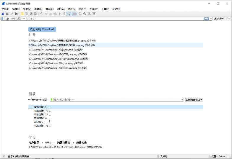 首先我们要选择本地正在使用的网卡信息,在捕获下面选中一个连接。双击之后,他就可以抓到通过这个网卡的所有数据包,这样我们可以通过分析其中抓到的数据,来验证我们程序的正确性。