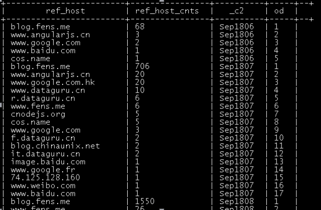 seletc ref_host,month,day,hour,count(1) as ref_host_cnt 选择域名,月日时,记录数