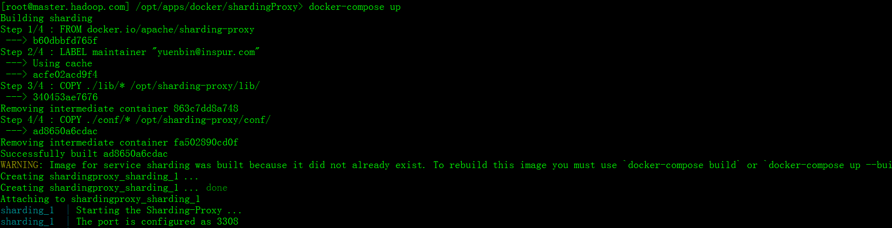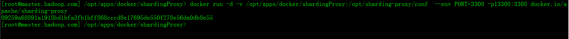 执行 docker run -d -v /opt/apps/docker/shardingProxy:/opt/sharding-proxy/conf --env PORT=3308 -p13308:3308 docker.io/apache/sharding-proxy
