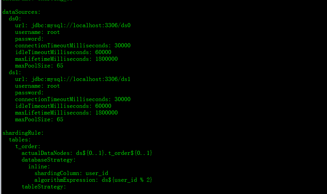 2) 两个数据库中分别创建了两张表,t_order,t_item,并在这里分别设置了两张表的数据分片规则,其中t_order取user_id为分片键,来获取数据源策略,使用user_id对2取余,用来产生真实表,相当于:ds0.t_order0,ds0.t_order1,ds1.t_order0,ds1.t_order1,t_order_item分片规则跟t_order类似,不再赘述