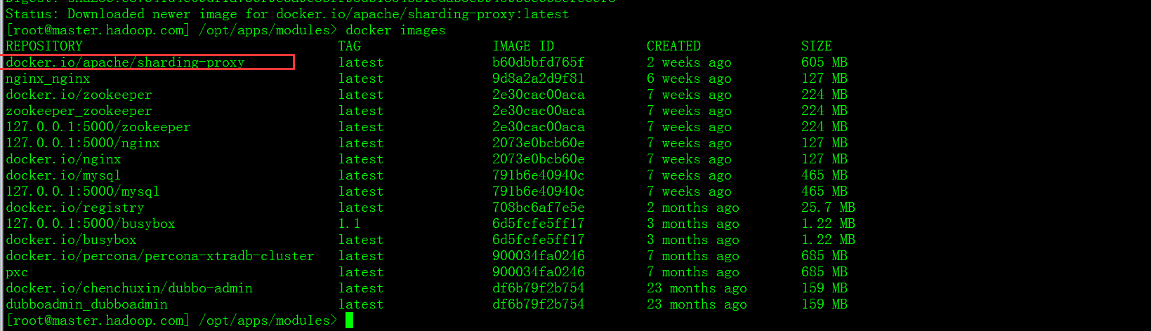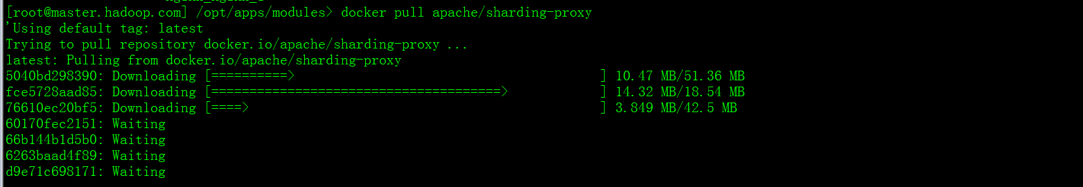 启动docker服务之后,我们就可以从官网拉取sharding-proxy的官方镜像文件,操作如下: