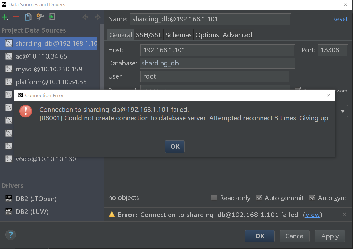 然后,这个时候兴冲冲的赶紧用DG工具远程连接sharding-proxy 却发现,怎么也连不上