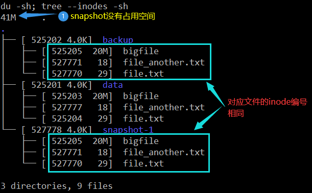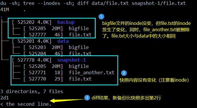 du -sh; tree --inodes -sh; diff data/file.txt snapshot-1/file.txt