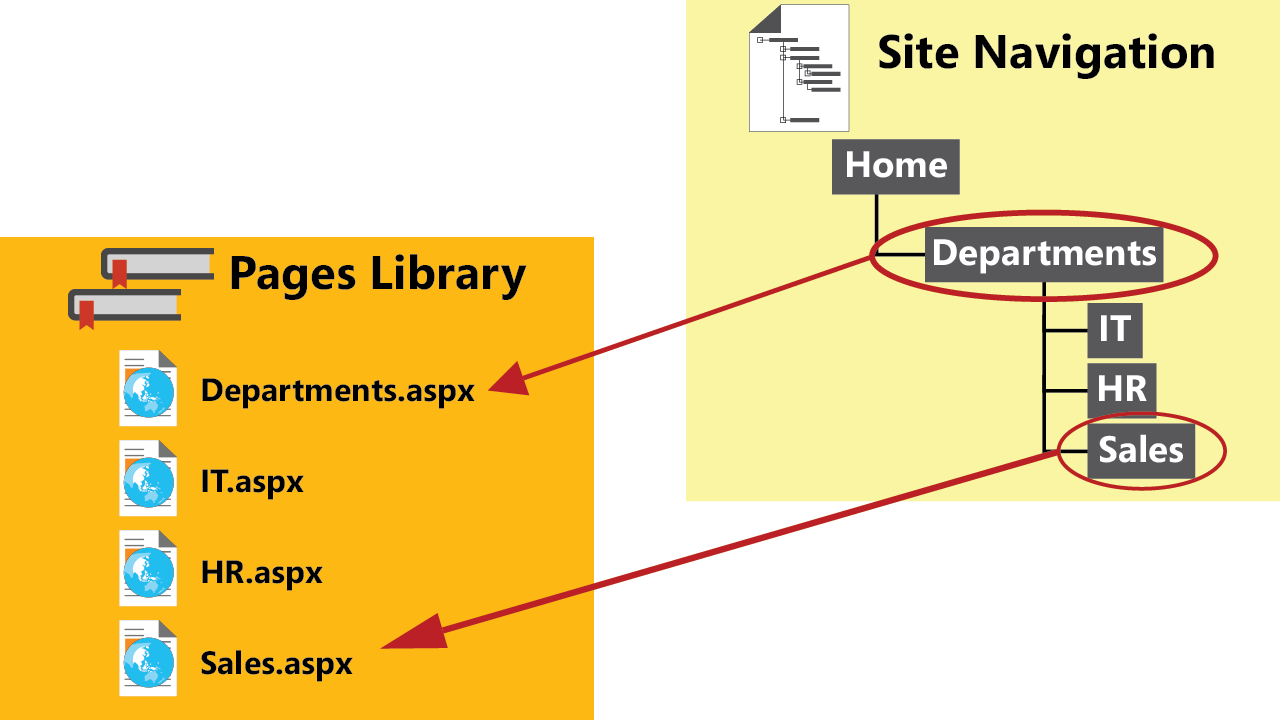 下图显示了一个分层导航结构,其顶部是主页,主页下方是Departments页面,Departments下面是IT,HR和Sales。层次结构中的Departments站点和销售站点导航链接中的箭头指向存储在页面库中的平面结构中的页面。