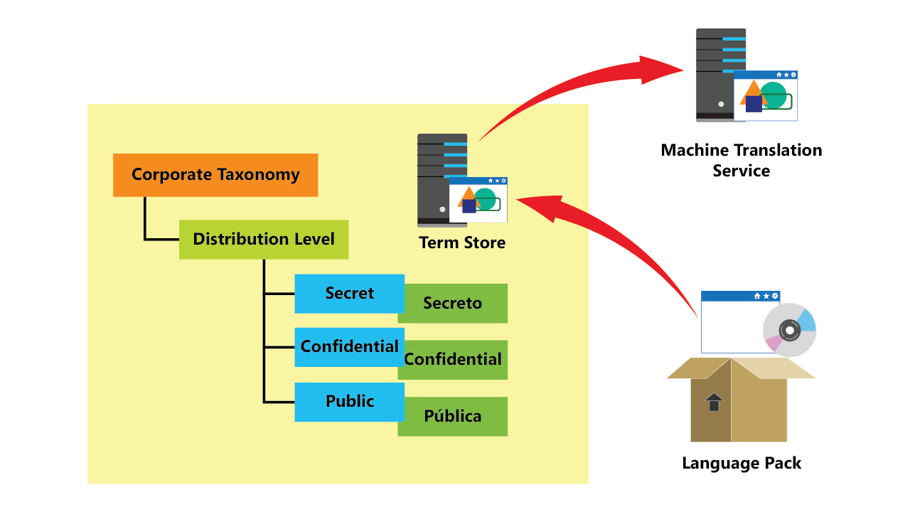 下图描绘了公司分类的一小部分。显示语言包,其中箭头指向术语库,以及从术语库指向机器翻译服务的箭头。