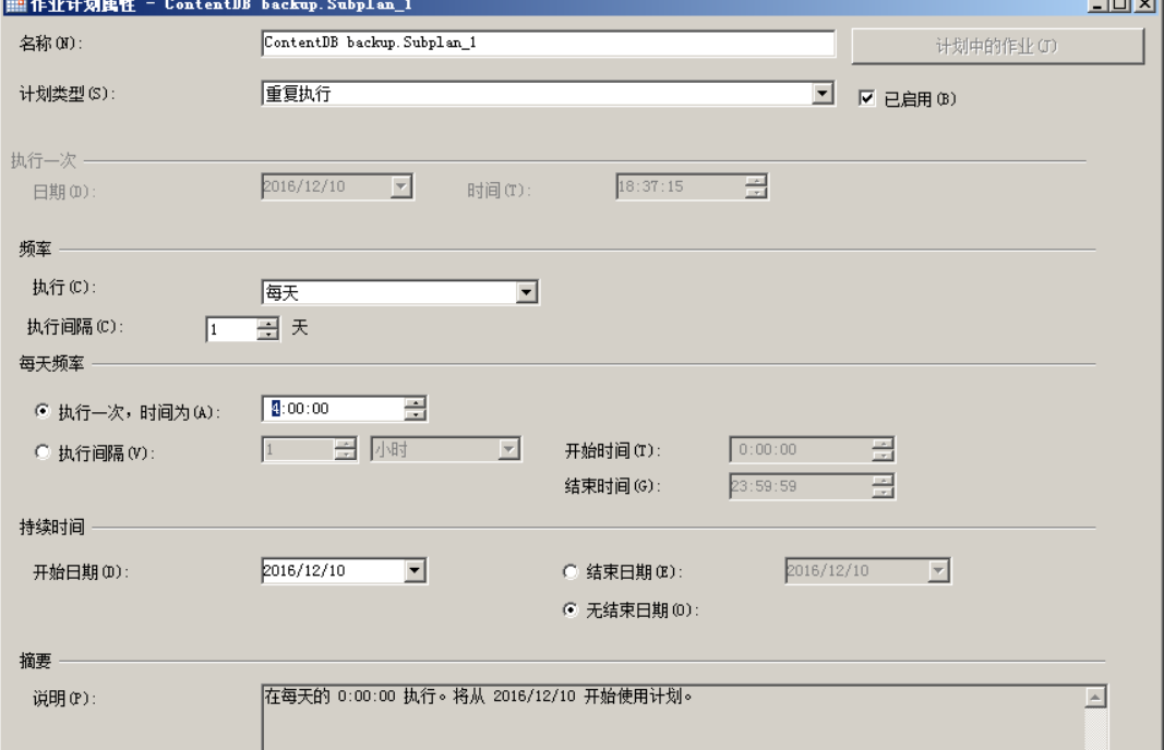 第三步,点击右侧的日历图标的红框,你可以配置自己的"作业计划属性",我这里配置的是:每天凌晨4点重复执行,完成后点击"确定"。