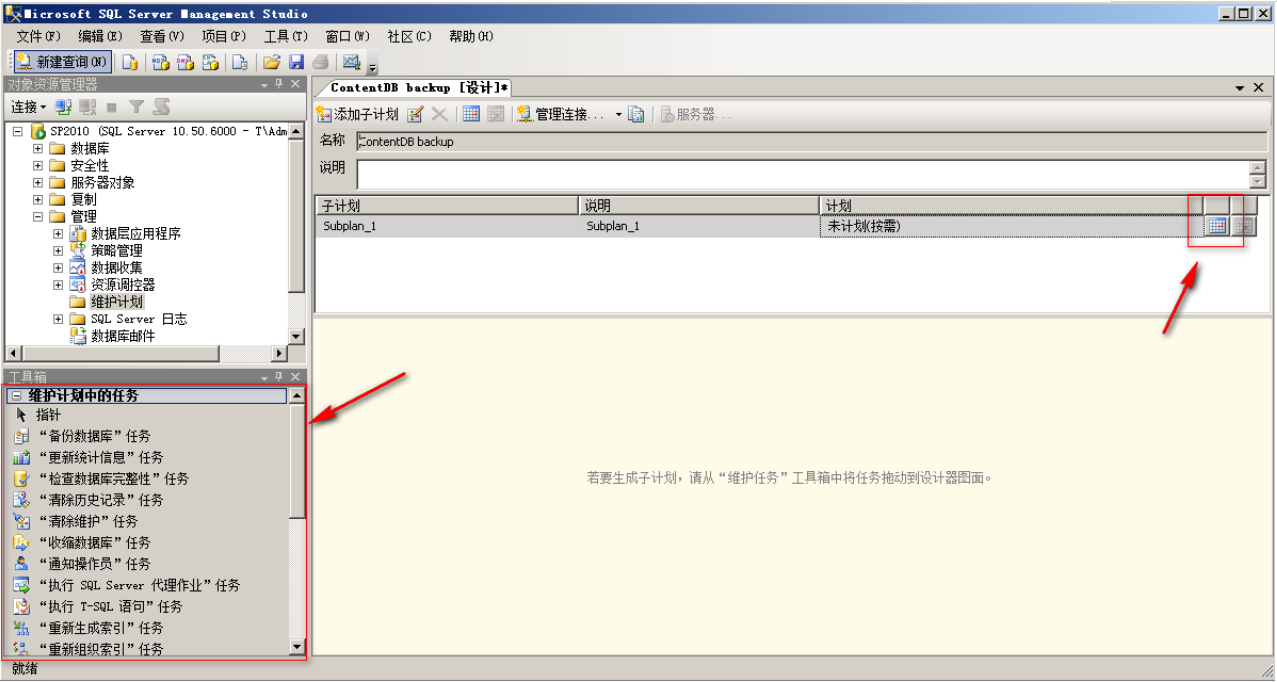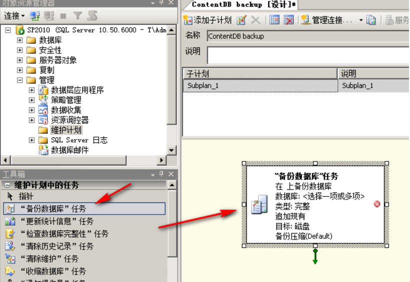 第四步:拖放第二步中左侧红框中的 "备份数据库"任务 到右侧,放到合适的位置。