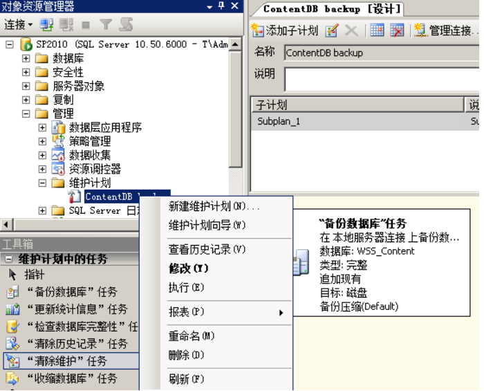 如果你的维护计划设计窗口已经关闭,那么就右击,选择"修改"重新打开设计界面就可以了