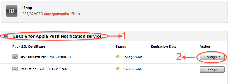 (3) 配置上一步中生成的App ID,让其支持消息推送[点击2-6中的Configureà选中Enable for Apple Push Notification serviceà点击Configure],如图所示: