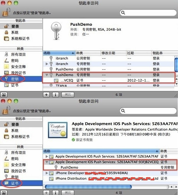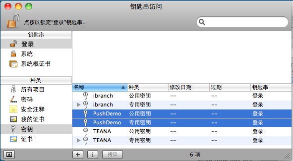 如果生成成功,则会在[钥匙串访问|登录|密钥]栏目中列出与*.certSigningRequest关联的密钥,这里是PushDemo,如图所示: