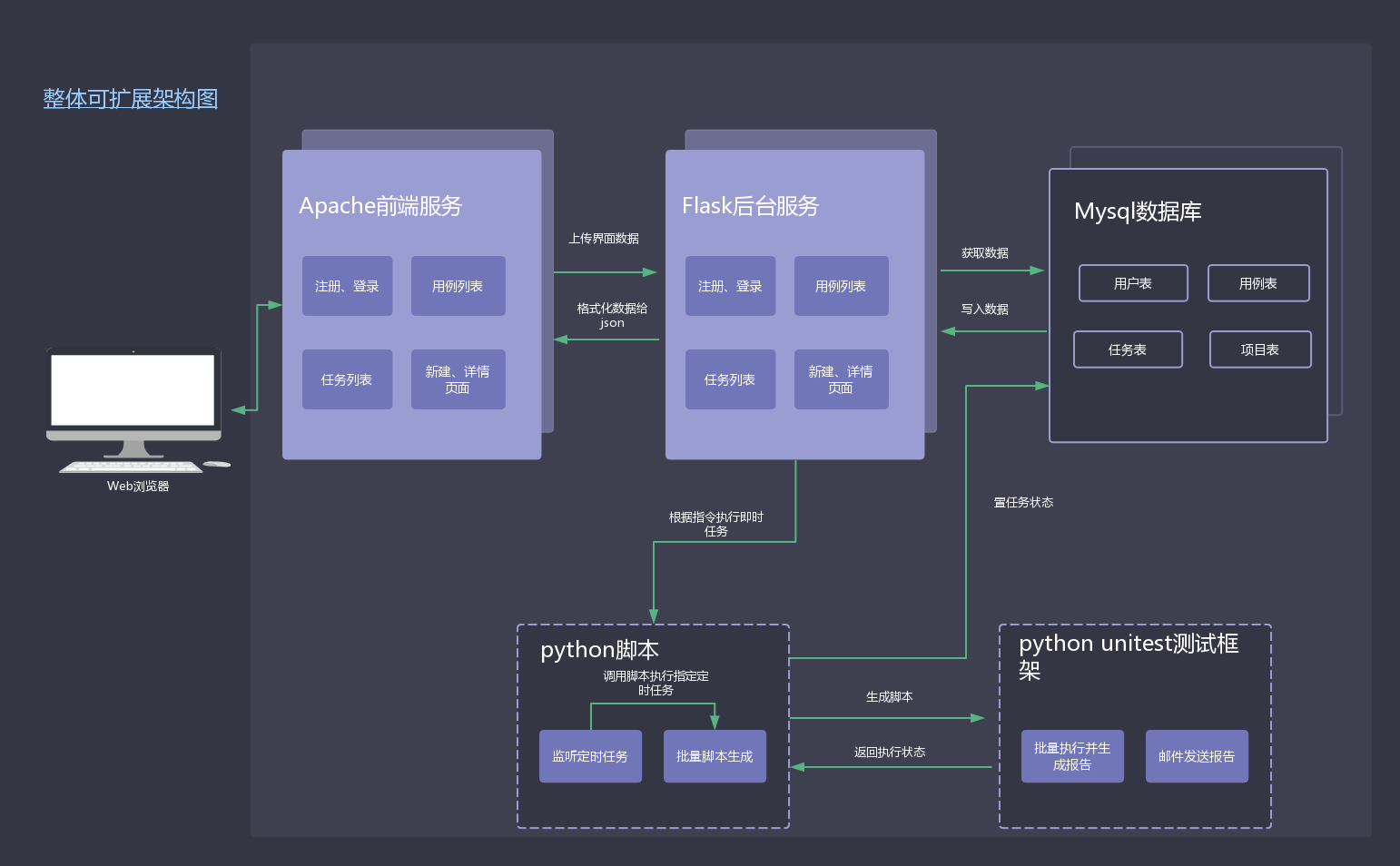 前端reactjs语言实现,后台由flask提供restful接口,基于python unittest测试框架,一键生成测试脚本,可视化的维护测试数据。
