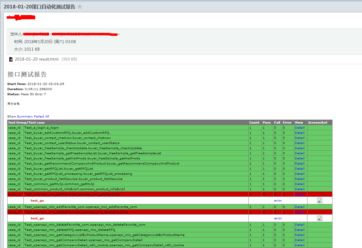 暂时发送人和接收人是写在代码里的,看需求再看是否需要做成前端配置,邮件会直接显示报告结果,也可以查看附件详细内容。