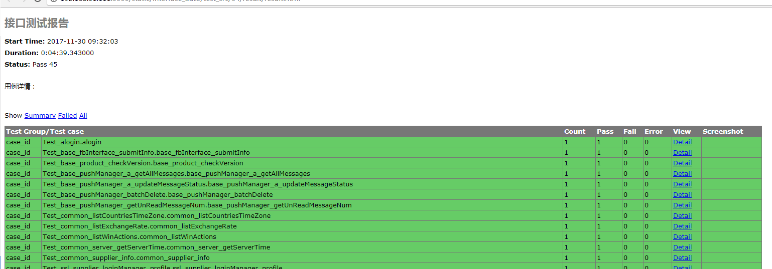 可按测试时间及给定文件名,生成对应时间的html可视化报告,报告内容包含测试耗时,测试执行用例总数,执行成功、失败、出错用例数统计;还有单个用例的执行情况(ID,用例名称,服务端返回值,运行结果等)