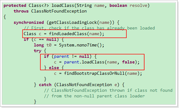 | protected Class<?> loadClass(String name, boolean resolve) throws ClassNotFoundException { synchronized (getClassLoadingLock(name)) { // First, check if the class has already been loaded Class c = findLoadedClass(name); if (c == null) { long t0 = System.nanoTime(); try { if (parent != null) { c = parent.loadClass(name, false); } else { c = findBootstrapClassOrNull(name); } } catch (ClassNotFoundException e) { // ClassNotFoundException thrown if class not found // from the non-null parent class loader }