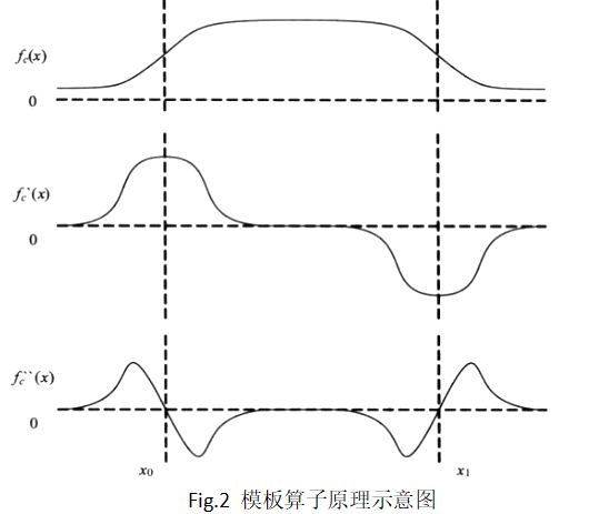 模板算子的理论基础:边缘是图像中像素灰度值突变的结果,也就是不连续的像素,对于这些突变的地方,它的微分运算中,一阶导数表现为极值点,二阶导数表现为过零点,因此,我们可以用微分算子来计算图像的边缘像素点,而这些微分算子,通常可以通过小区域的模板卷积来近似计算,这种小区域模板就是边缘检测的模板算子,这种模板卷积计算边缘像素的方法就叫做模板算子法。我们通过图示来说明一下,如图Fig.2所示,该图引自《C#数字图像算法典型示例》,对于边缘检测函数f(x),在边缘点x0和x1处,它的一阶导数表现为极值点,极大值或者极小值,而二阶导数表现为过零点,在x0和x1处二阶导数为0。