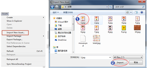 q 单击Asset|Import New Asset命令,在弹出的Import New Asset对话框中,找到存放资源的位置,选中后单击Import按钮即可,如图1-12所示。