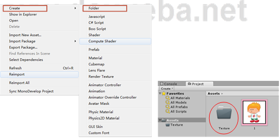 要在资源面板里创建文件夹,可以在资源面板里单击鼠标右键,从弹出的快捷菜单中单击Create|Folder命令。如图1-15所示,在资源面板中创建了一个名为Texture的文件夹。