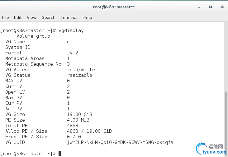 sudo vgdisplay //主要是查看卷组名,记着下面要用