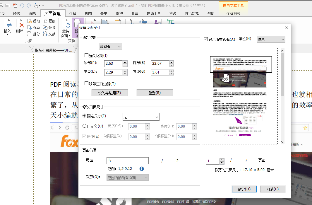 - 点击“页面管理-裁剪页面”,拖动选择框选中需要裁剪的位置,双击裁剪部分后会弹出设置对话框
