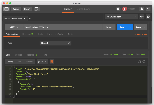 然后我在节点2上挖出一些新的区块,以确保链更长。之后,我在节点1上调用GET /nodes/resolve,其中链被共识算法替代。