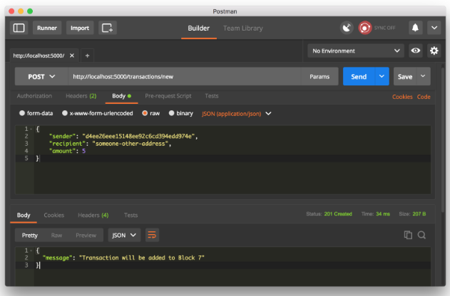 new_transaction()将一个交易添加到列表中后,它将返回下一个将被挖出的块的index。这对提交交易的用户很有用。