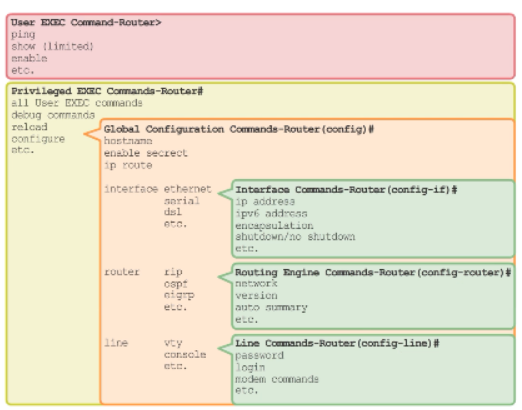 - 命令行状态显示为Router(config-mode)#,其中mode应该被替换为某种具体的模式,一般我们要配置很具体的某个细节的参数时,才会用到此模式,诸如线路配置模式,接口配置模式,路由配置模式等等。。。