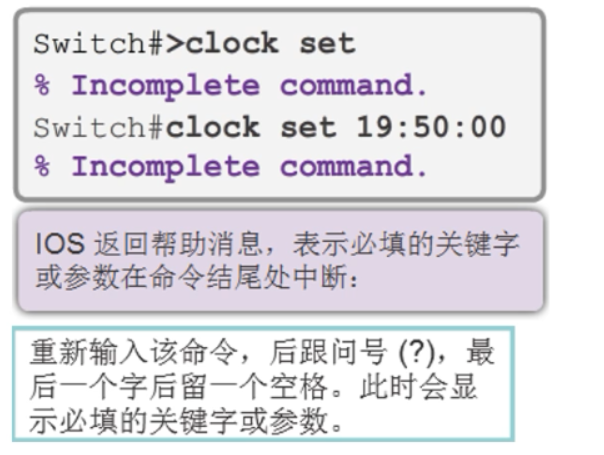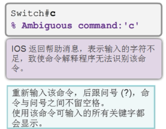 注意,只有当前已经输入的字符已经能唯一的确定一条指令时,tab键补全才会生效。如已经输入字符cl 但 cl --> clock clear 系统无法判断要用哪个,只有输入了clo或cle再按tab才会补全。