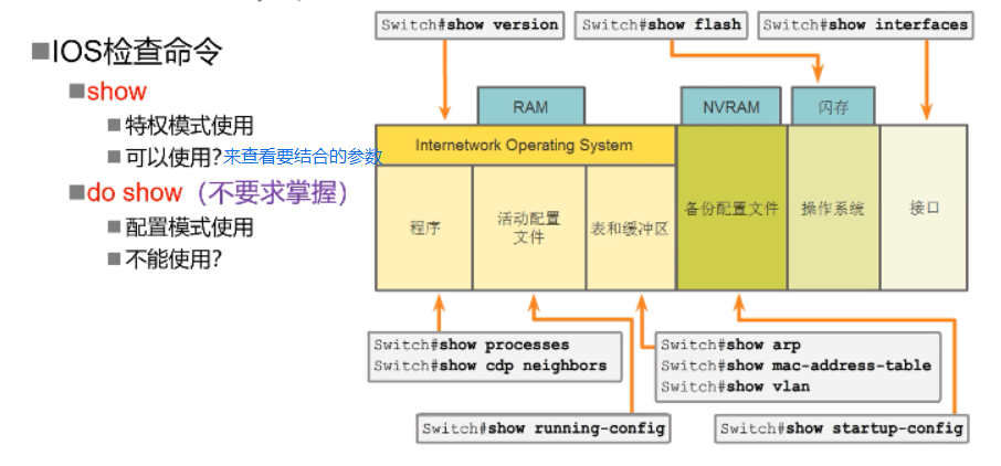 - 设备开机时,将IOS从Flash复制到内从(RAM)中。特别地,加载思科操作系统时会将操作系统整个加载进内存中,这点和PC不同,PC只是加载内核。