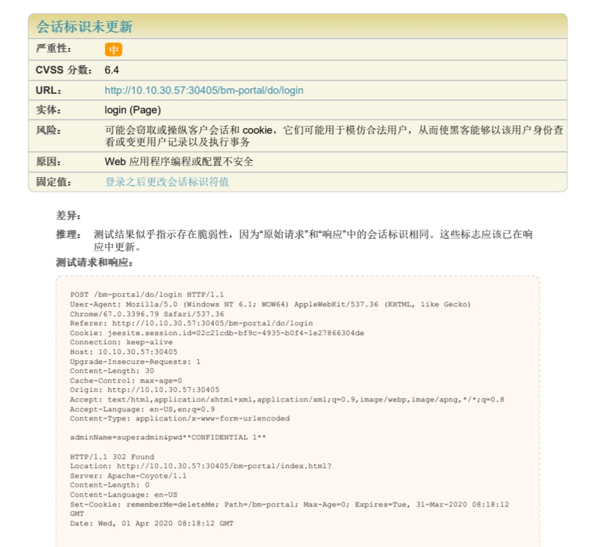 解决方案: 在登录之前增加代码: SecurityUtils.getSubject().logout(); 但是实际情况是加上后导致appscan经常重复登录,非法会话。但漏洞扫描不出来了,但是扫描速度超慢。 来源:oschina链接:https://my.oschina.net/u/4170983/blog/3225271 标签 appscan